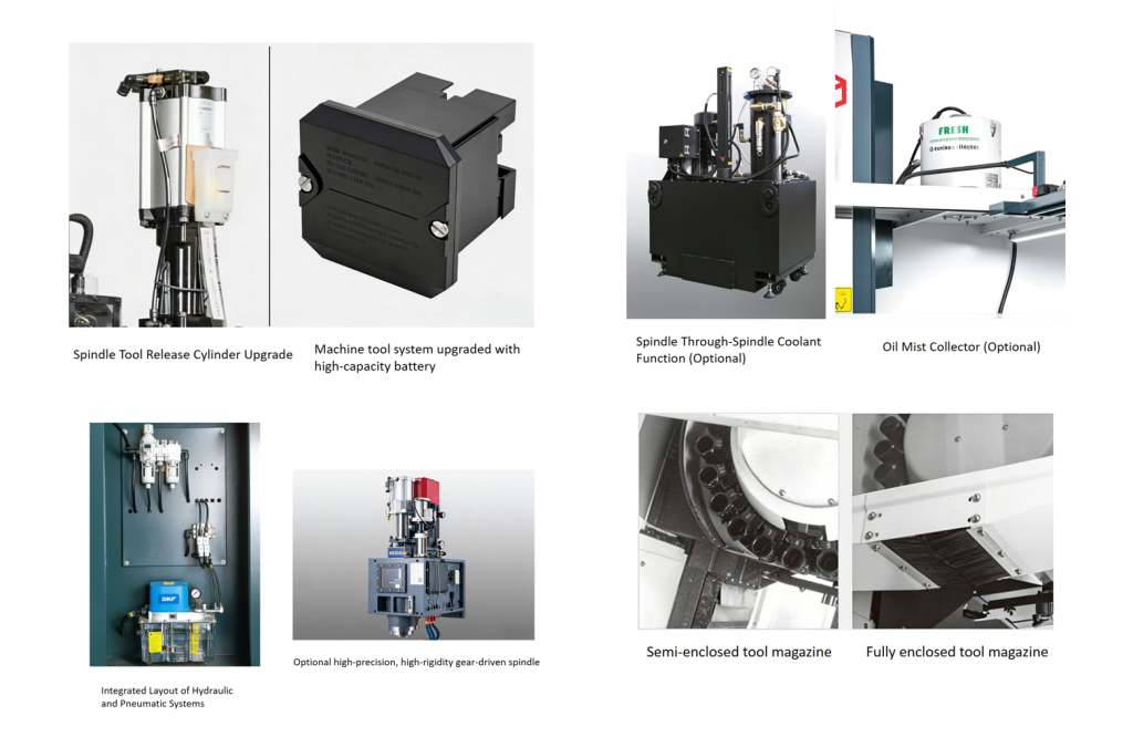 The DVS series’ cutting fluid systems deliver precise supply with built-in spindle coolant ring spray and optional spindle center through coolant, aiding cooling, chip removal, and tool life extension, and matching with oil-water separation systems for environmental protection.
