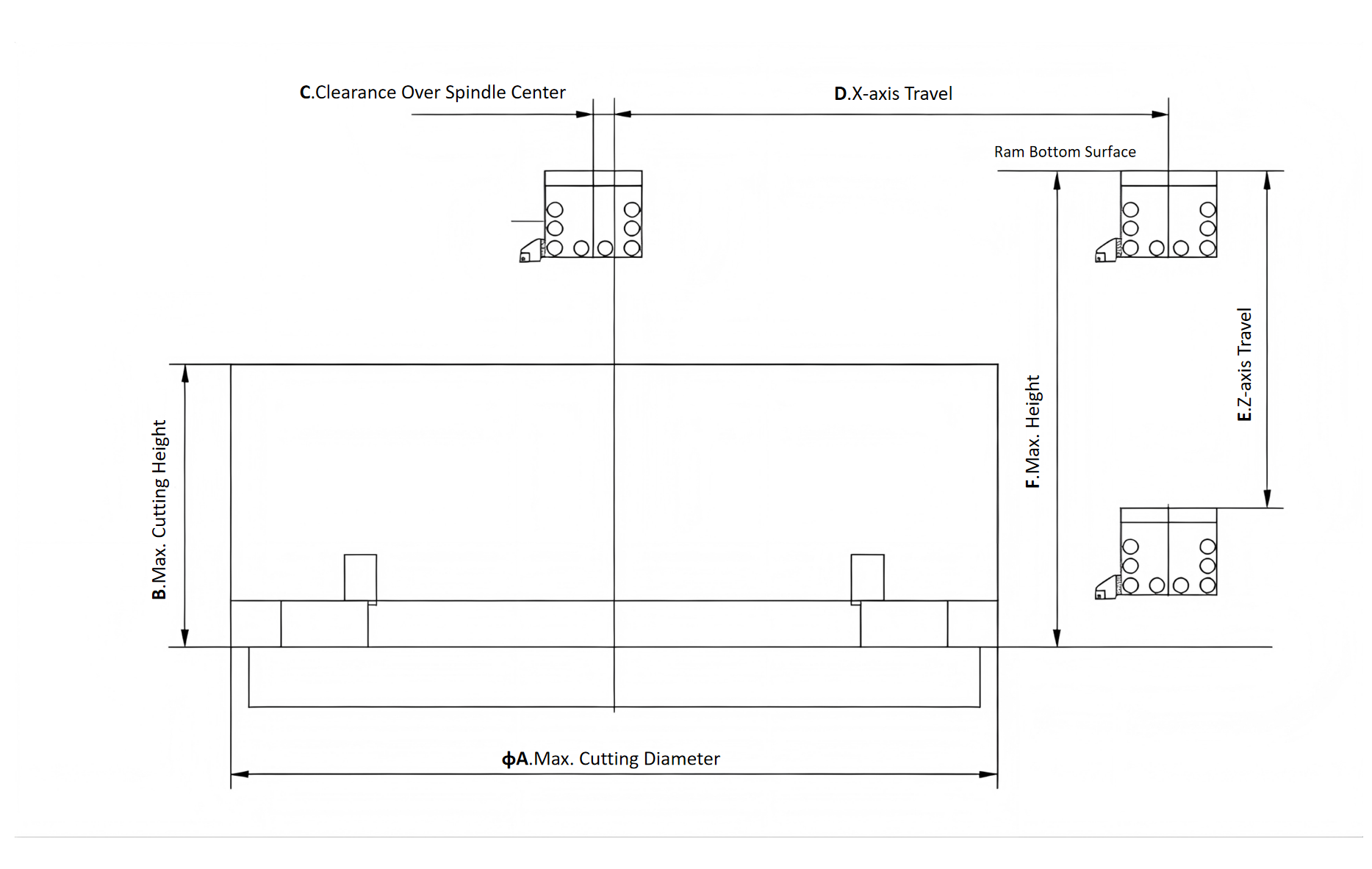 | Model | Unit | A (Max. Turning Diameter) | B (Max. Turning Height) | C (Clearance Over Spindle Center) | D (X-axis Travel) | E (Z-axis Travel) | F (Max. Height from Ram Bottom to Table) |